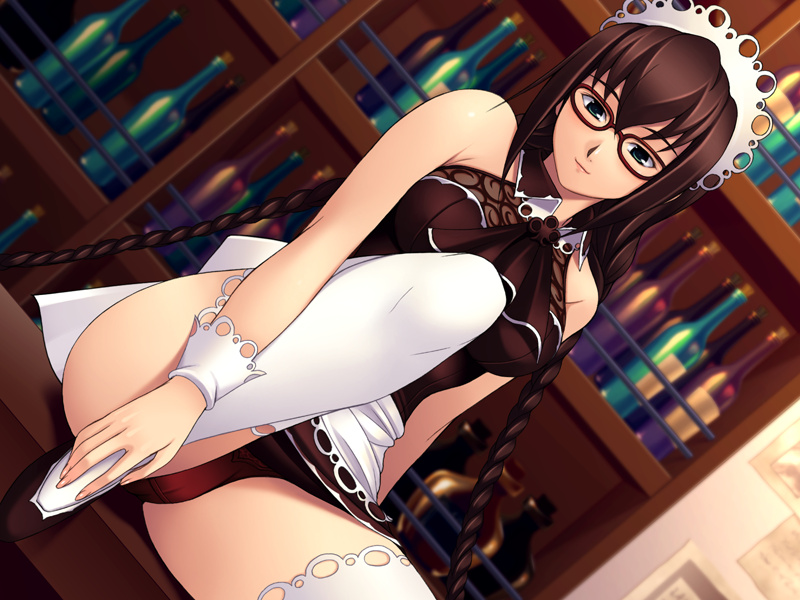 1girlapronbar (place)bare shouldersbraidbrown hairbrown pantiesfemale focusglassesgreen eyeslong hairmaidmaid apronmaid headdresspantiessmilesolospread legsthighhighstwin braidsunderwear