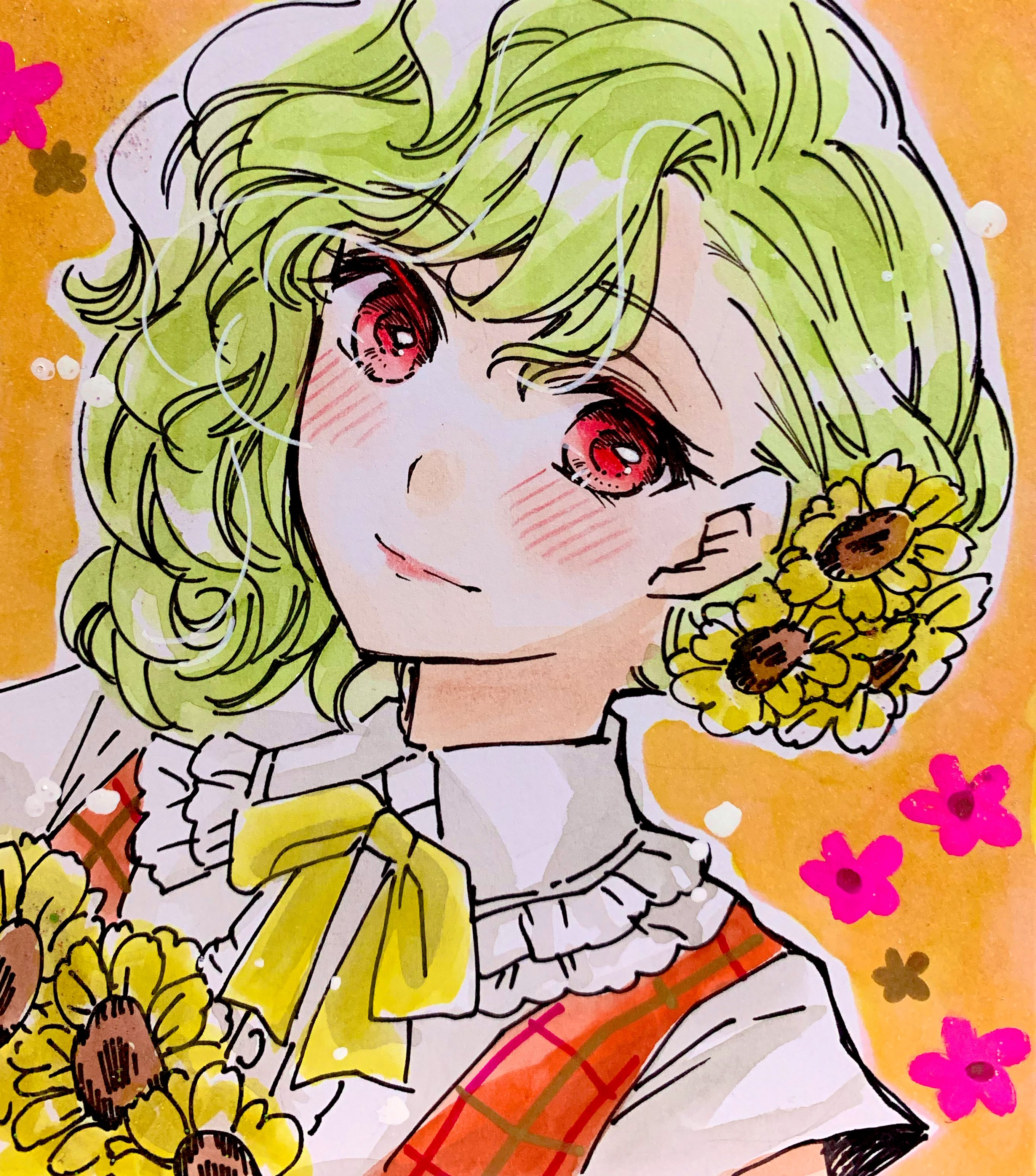 1girlascotflowergreen hairhair flowerhair ornamentlooking at viewermedium hairorange backgroundred eyesshirtsolosunflowerwhite shirtyellow ascotyellow flower