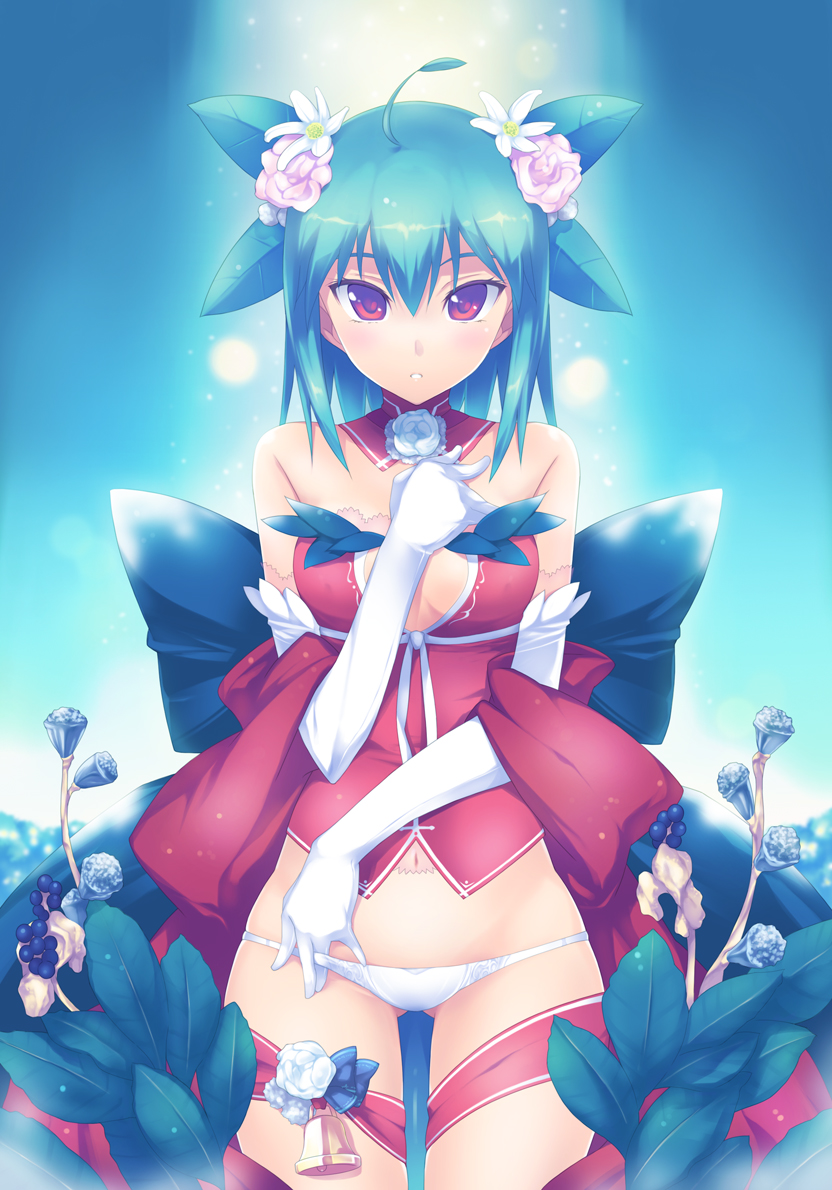 1girlahogebellchristmaselbow glovesfemale focusflowerglovesgreen hairhair flowerhair ornamentlowleglowleg pantiesmonster girlnavelpantiesred eyesribbonshort hairsolounderwear