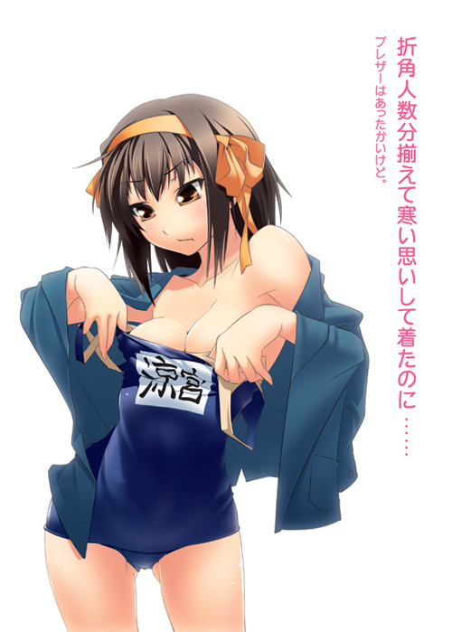00s1girlbreastsbrown eyesbrown haircleavageclothes pullfemale focushairbandjacketjacket on shouldersone-piece swimsuitone-piece swimsuit pullpulling another's clothesschool swimsuitshort hairsmall breastssoloswimsuitundressing