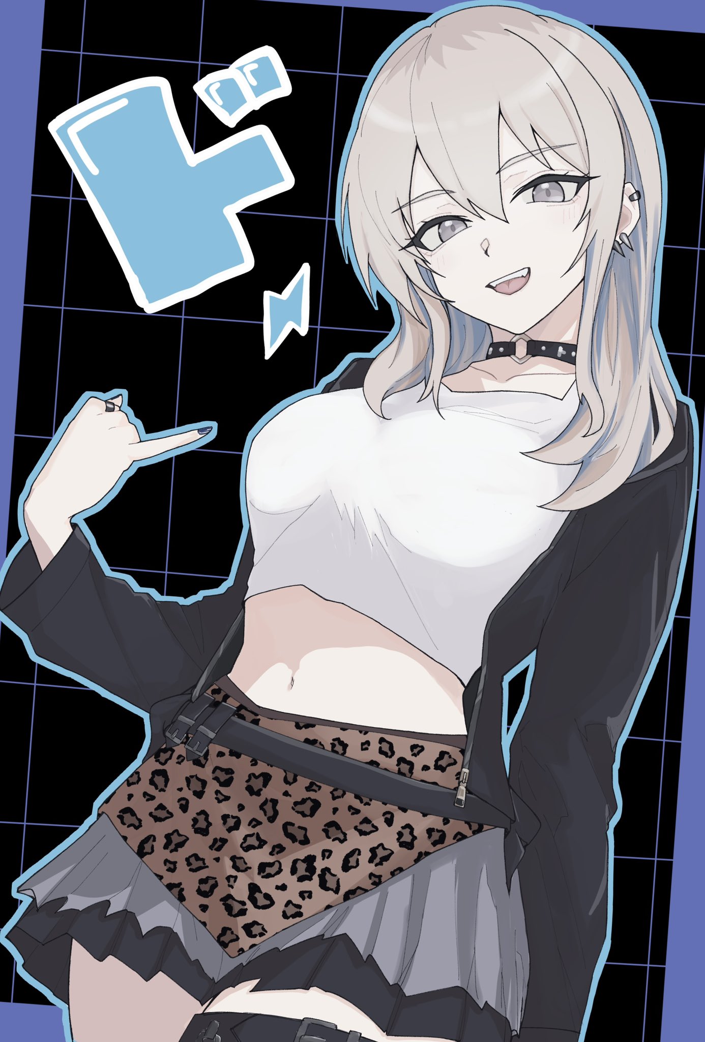 1girlblack chokerblack jacketblue nailsblue outlinebreastschokercowboy shotcrop topear piercinggrey eyesgrey hairhair between eyesjacketjewelrylarge breastslong hairmidriffmulticolored hairnail polishnavelo-ringo-ring chokeropen clothesopen jacketopen mouthoutlinepiercingpinky outringroots (hair)solotank topteeththigh strapupper teeth onlywhite tank top