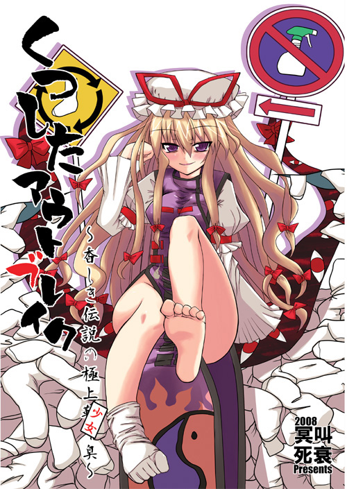 1girlbarefootblonde hairbonnetbreastsdressfeetfemale focusgap (touhou)hair ribbonhatlong hairno pantiespurple eyesribbonroad signsignsingle socksockssolotoe sockswhite background