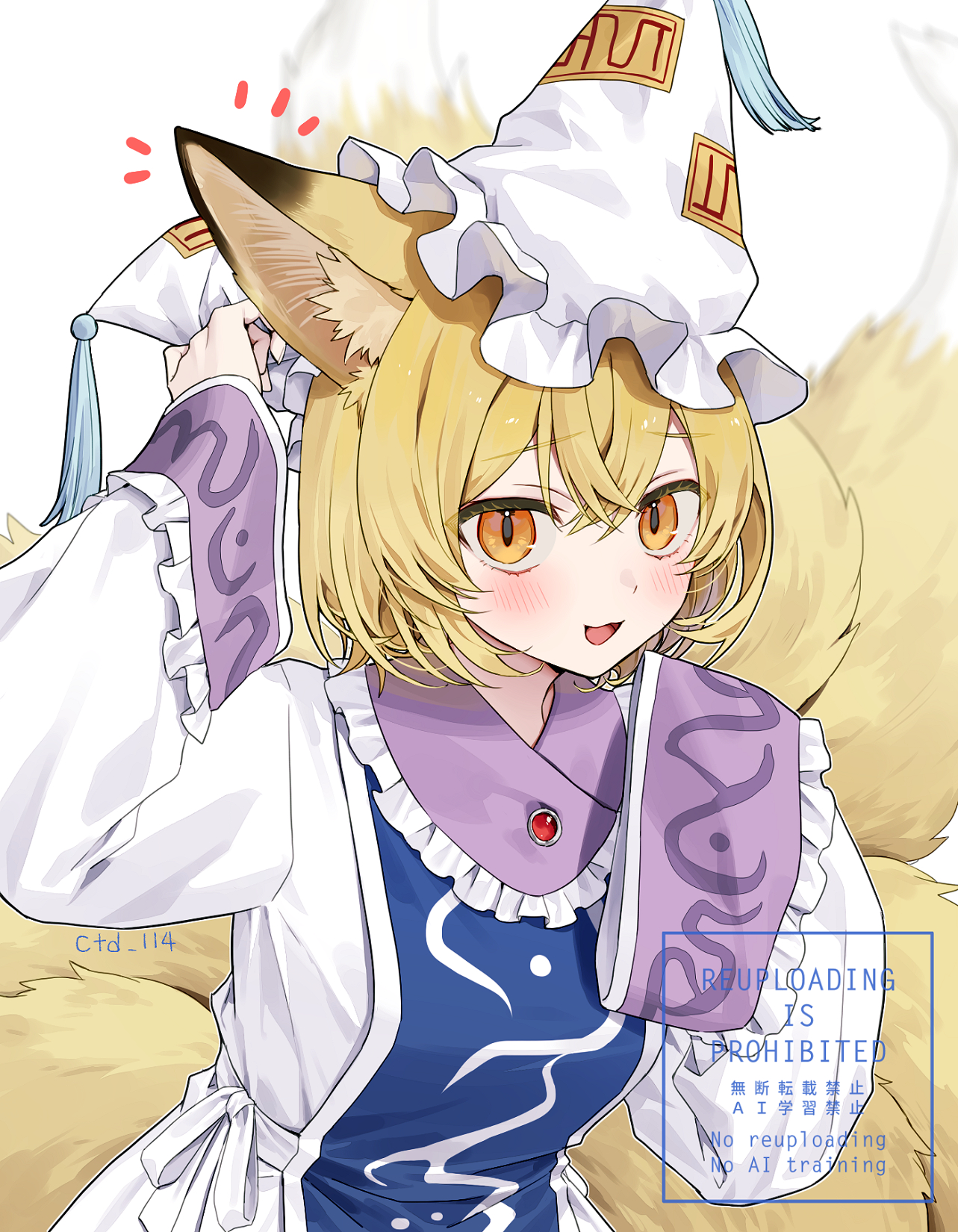 :d1girlanimal ear fluffanimal earsartist nameblonde hairblue tabardblushdressfox earsfox girlfox tailhands uphatlong sleeveslooking at viewermob capmultiple tailsopen mouthorange eyesshort hairsimple backgroundsleeves past fingerssleeves past wristssmilesolotabardtailupper bodywatermarkwhite backgroundwhite dresswhite hat