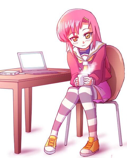00s1girlblushfemale focuslong hairpink hairsmilesolostriped clothesstriped thighhighsthighhighsyellow eyes