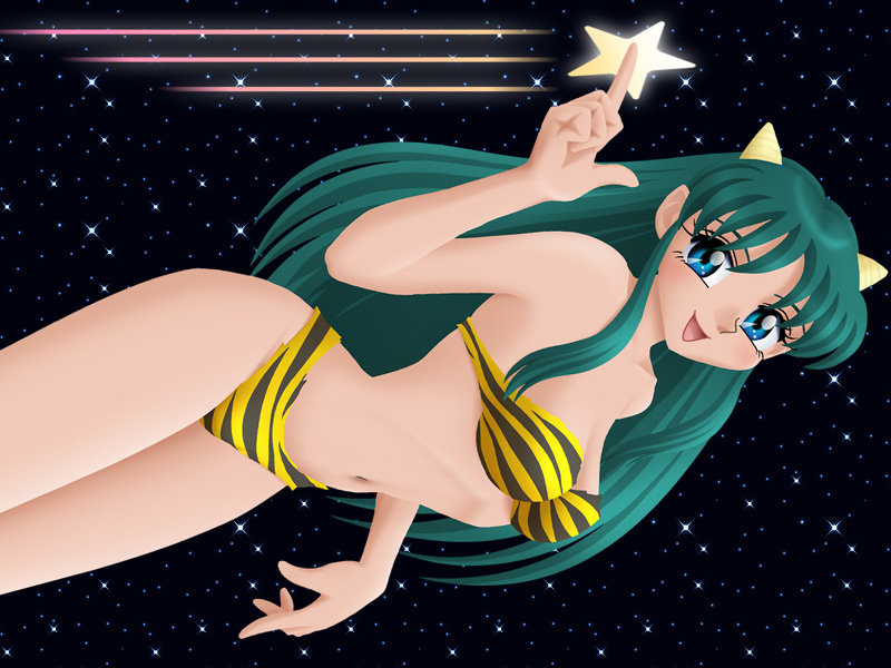 animal printbikiniblue eyescone hornsgreen hairhornslong haironisolospacestar (symbol)striped hornsswimsuittiger printyellow horns