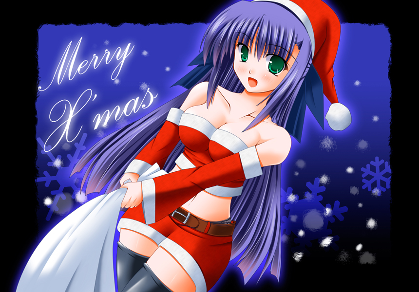 00sbeltbreastschristmascleavagegreen eyeshatlarge breastslong hairmidriffnavelpurple hairsacksanta costumesanta hatsolothighhighs