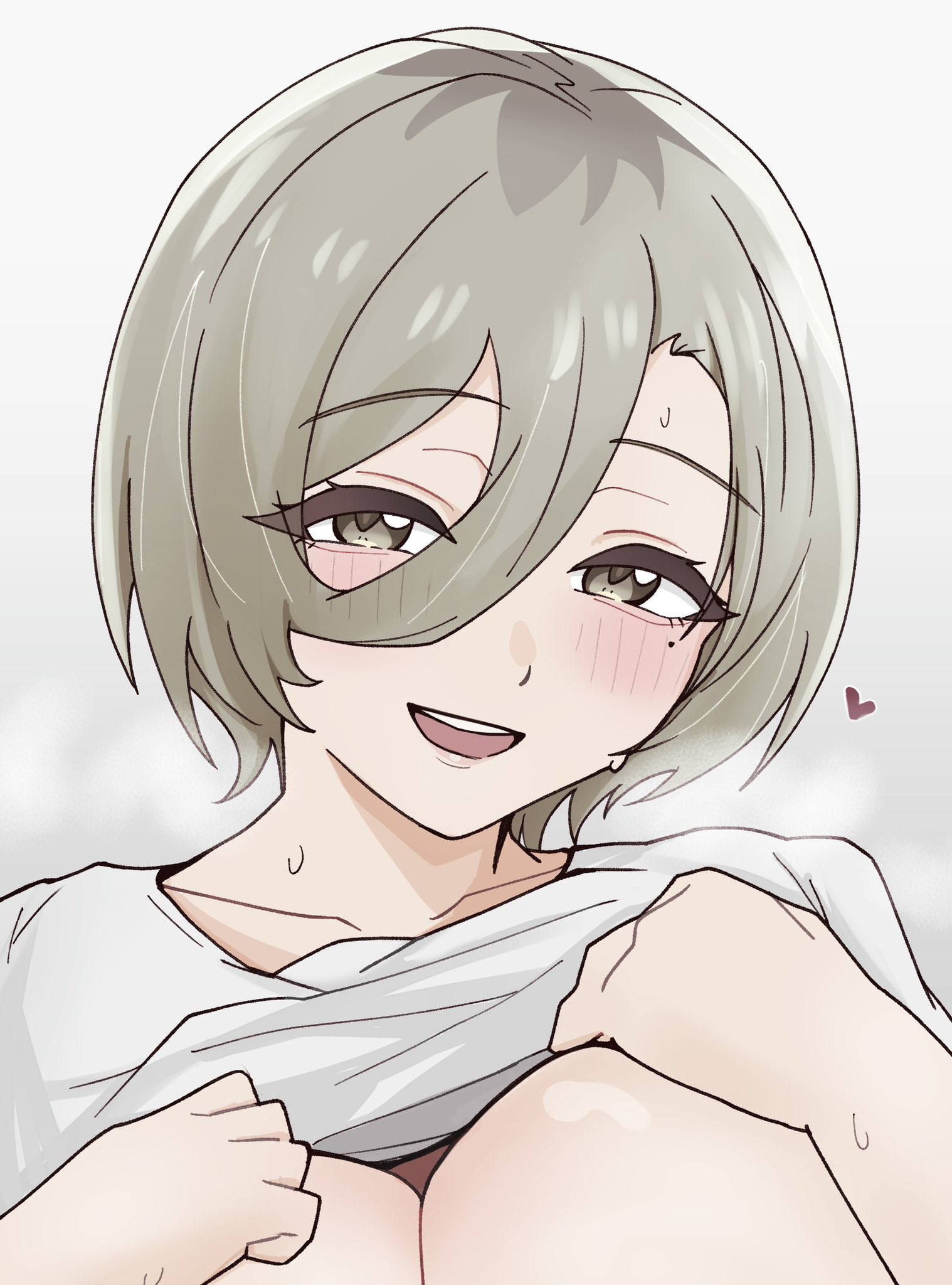 1girlaegyo salblushbreathbrown eyesbrown hairclothes liftgrey backgroundhair between eyesheartlong hair between eyesmolemole under eyemulticolored hairopen mouthroots (hair)shirtshirt liftsoloteethupper bodyupper teeth onlywhite shirt