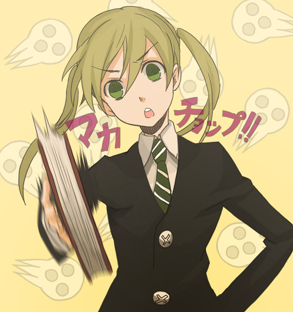 00s1girlbookbrown hairfemale focusgreen eyeslong hairnecktieopen mouthschool uniformsoloteethtwintails