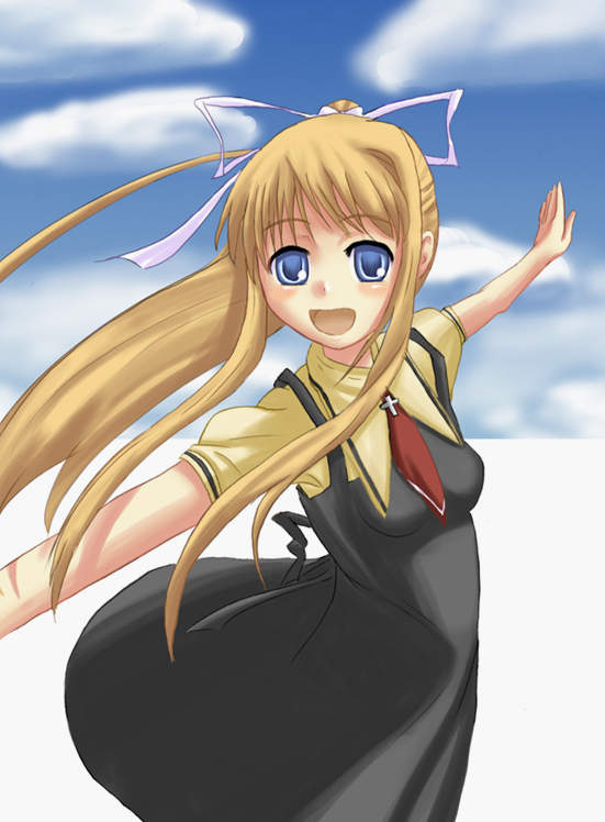 nikki (series), shining nikki, artist request, game cg, highres, official art, 1boy, belt, belt buckle, bird, black belt, blazer, blonde hair, blue eyes, blue sky, breast pocket, buckle, buttons, closed mouth, cloud, collarbone, collared jacket, collared shirt, cowboy shot, day, dove, dress pants, floating hair, flock, flower, gloves, hair between eyes, half gloves, hand on own chest, happy, holding, holding jewelry, holding necklace, jacket, jewelry, lapels, layered sleeves, light particles, light rays, loen (shining nikki), long sleeves, looking at viewer, necklace, notched lapels, outdoors, pants, pocket, red jacket, shirt, short hair, sky, smile, solo, standing, striped clothes, striped shirt, sunlight, thigh belt, thigh strap, vertical-striped clothes, vertical-striped shirt, white flower, white gloves, white pants, white shirt, wind
