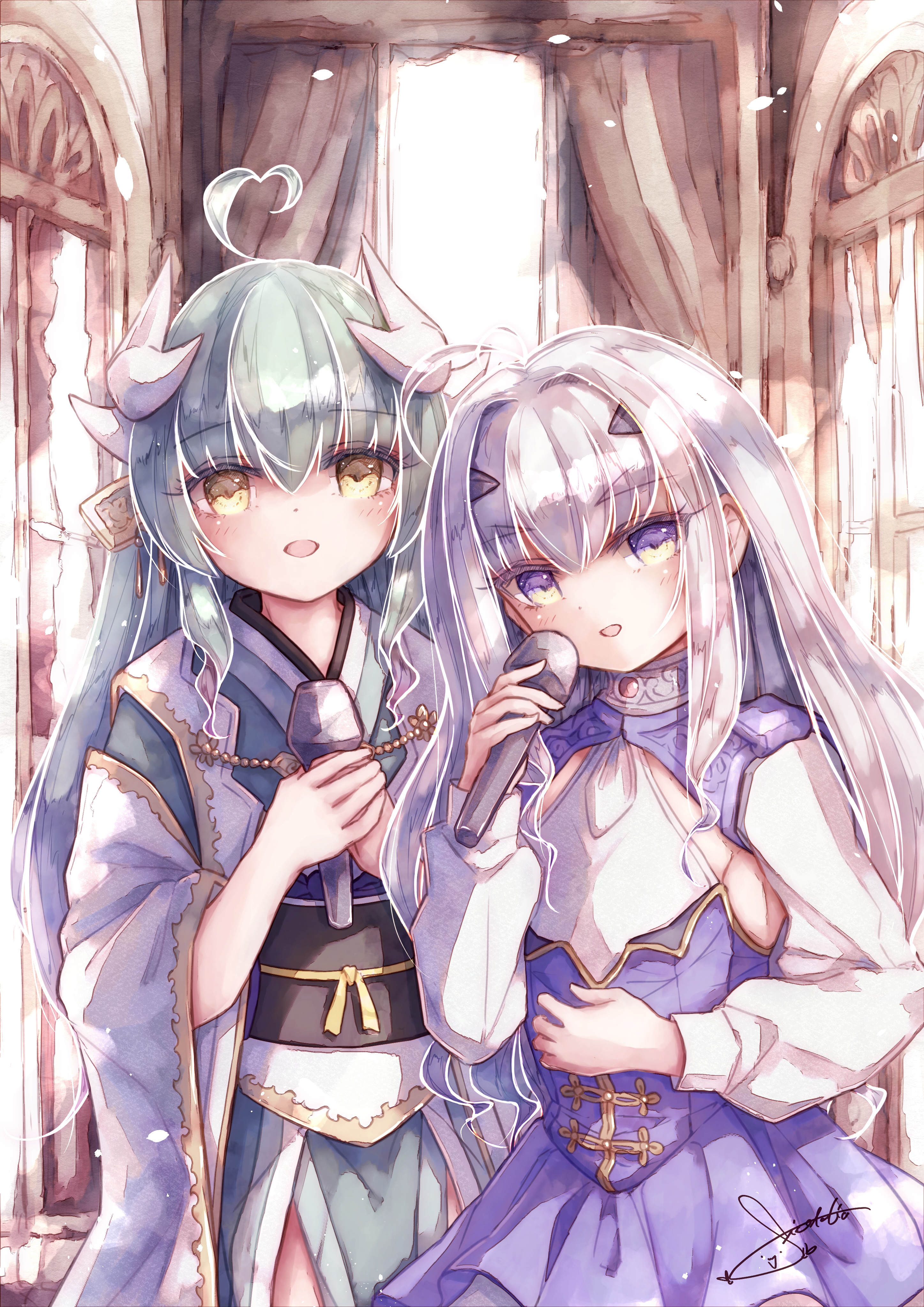 2girlsahogeblushdragon girldragon hornsdressgreen hairgrey hairhair between eyeshair ornamentholdingholding microphonehornsjapanese clotheslong hairlong sleeveslooking at viewermicrophonemultiple girlsopen mouthpurple dresspurple eyessignaturesmilevery long hairwide sleevesyellow eyes