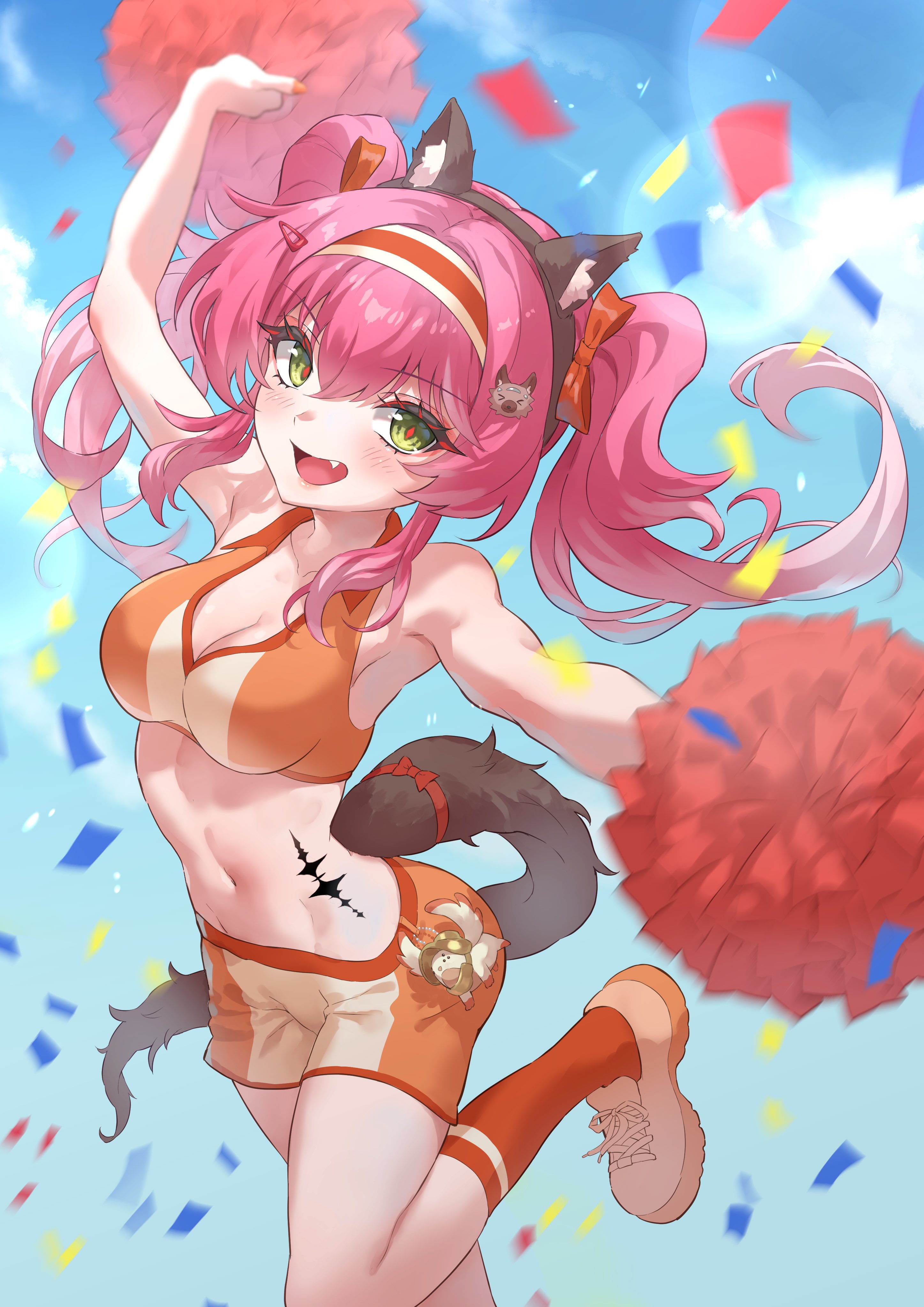 1girlalternate costumeanimal ear hairbandanimal earsbare shouldersblue skybreastscat ear hairbandcat earscheerleadercleavagecollarbonedayfake animal earshair ornamenthairbandlong hairlooking at viewermedium breastsnail polishnavelopen mouthorange nailsorange shortsorange socksoutdoorspink hairpom pom (cheerleading)red pupilsshoesshortsskysmilesneakerssockssolostomachsweatbandtacet mark (wuthering waves)tailtwintailswhite shoeswolf tailyellow eyes