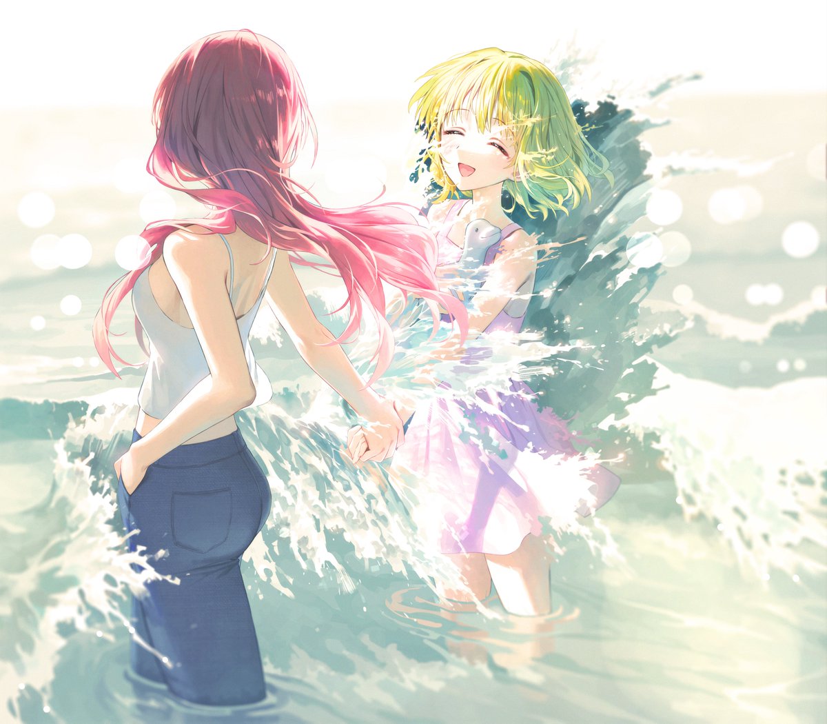 2girlsblonde hairblue pantsblurrybokehcamisoleclosed eyescrop topdenimdepth of fielddressfacing anotherhand in pocketholdingholding handsholding stuffed toyjeanslong hairmultiple girlsoceanofficial alternate hair lengthofficial alternate hairstyleopen mouthpantspink dressred hairshort hairsmilespaghetti strapstuffed toywadingwaveswhite camisole
