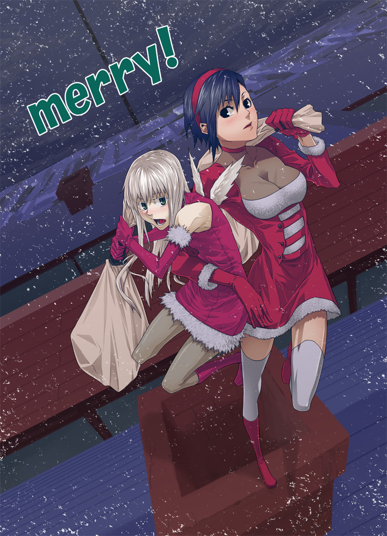 2girlsblue eyesbreastschristmascleavageelbow glovesgloveslarge breastslong hairmultiple girlssanta costumeshort hairthighhighswings