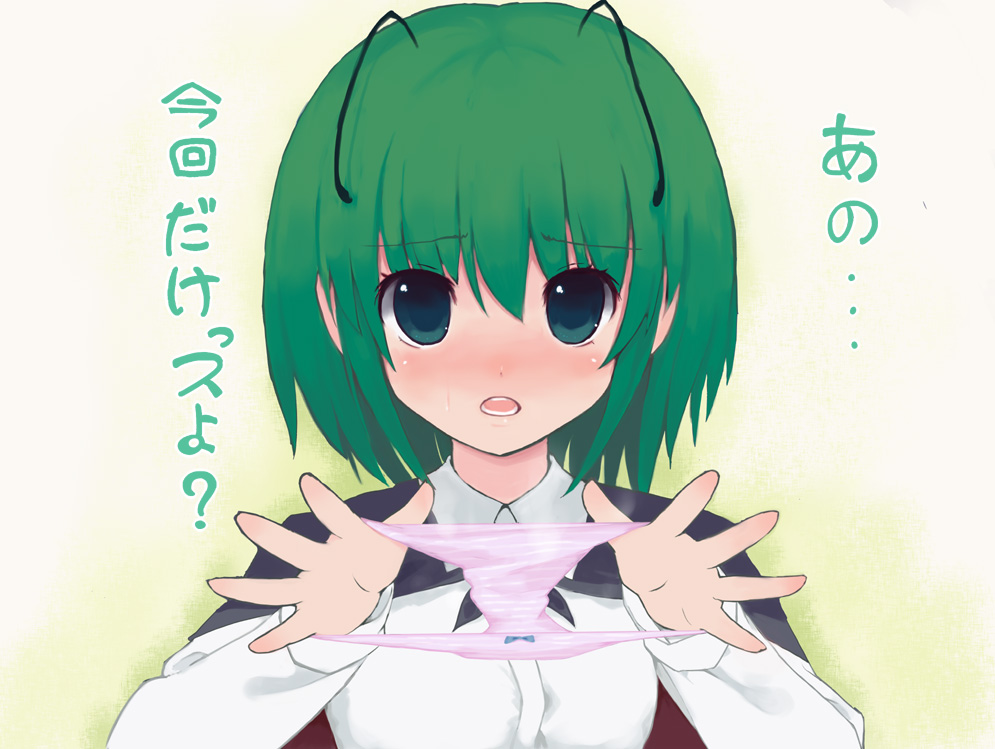 1girlantennaeblushbowbow pantiesfemale focusgreen eyesgreen hairholdingholding pantiesholding underwearholding unworn clothesmatching hair/eyespantiespink pantiespresenting removed pantiesshort hairsmellsolotext focusunderwear