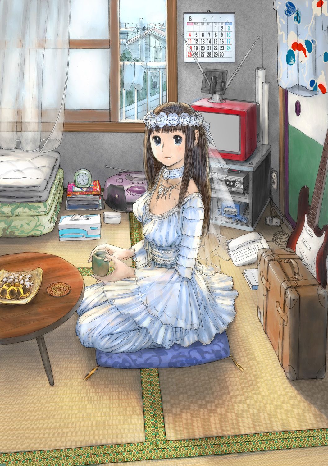 1girlalarm clockblue eyesbridal veilbridebrown haircalendar (object)chokerclockcorded phonecupcushiondresselectric guitarfemale focusfoodgame consolegamecubeguitarindoorsinstrumentjewelrykneelinglong hairnecklacephoneroomseizasenbeisittingsmilesolosuitcasetabletatamiteatissue boxveilwedding dresswindowyunomizabuton