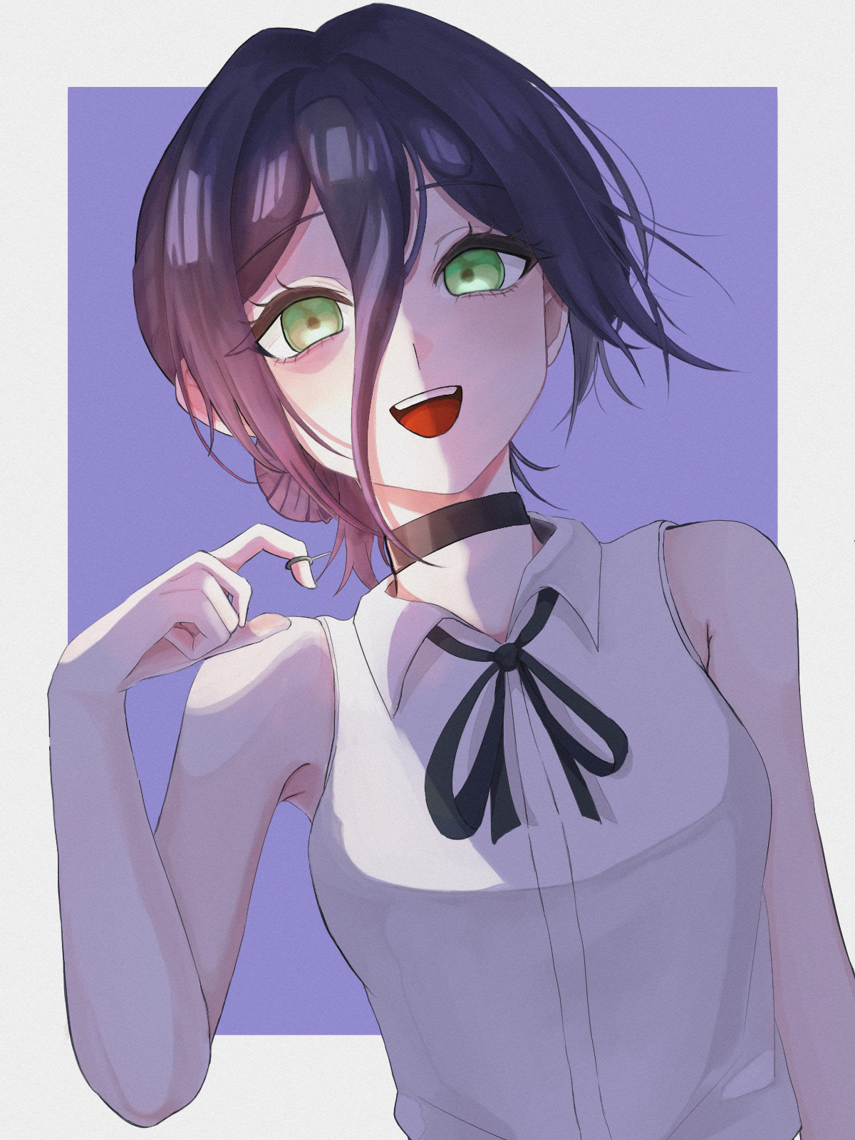 isgod, kawashiro nitori, touhou, commentary request, highres, 1girl, alternate costume, analog clock, bags under eyes, black tank top, blue eyes, blue hair, breasts, clock, compression sleeve, green hat, hair bobbles, hair ornament, hat, looking at viewer, medium breasts, midriff, navel, newsboy cap, open mouth, short hair, solo, sweat, tank top, two side up, upper body, wrench
