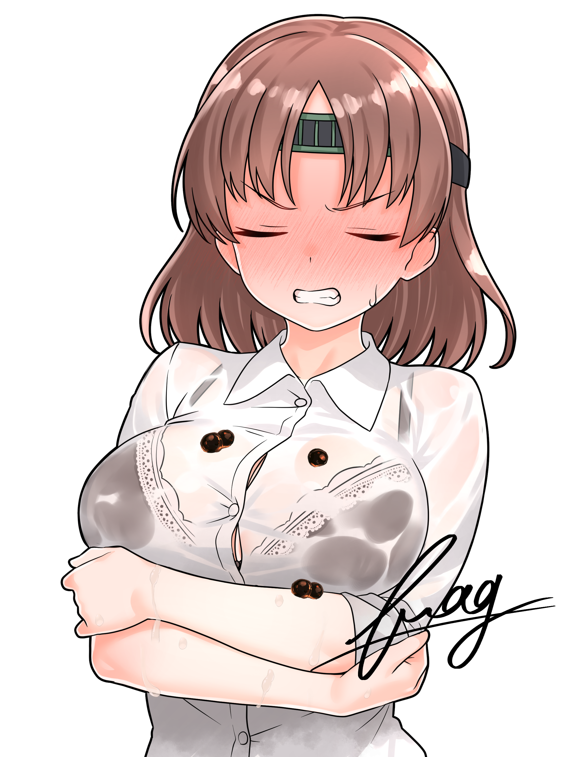1girlartist nameblack brabrabra visible through clothesbreastsbrown hairbubble tea challenge failureclosed eyescollared shirtcrossed armsembarrassedfacing viewerlarge breastsmedium hairsee-through clothessee-through shirtshirtsignaturesimple backgroundsleeves rolled upsolounderwearupper bodywatermarkwhite backgroundwhite shirt