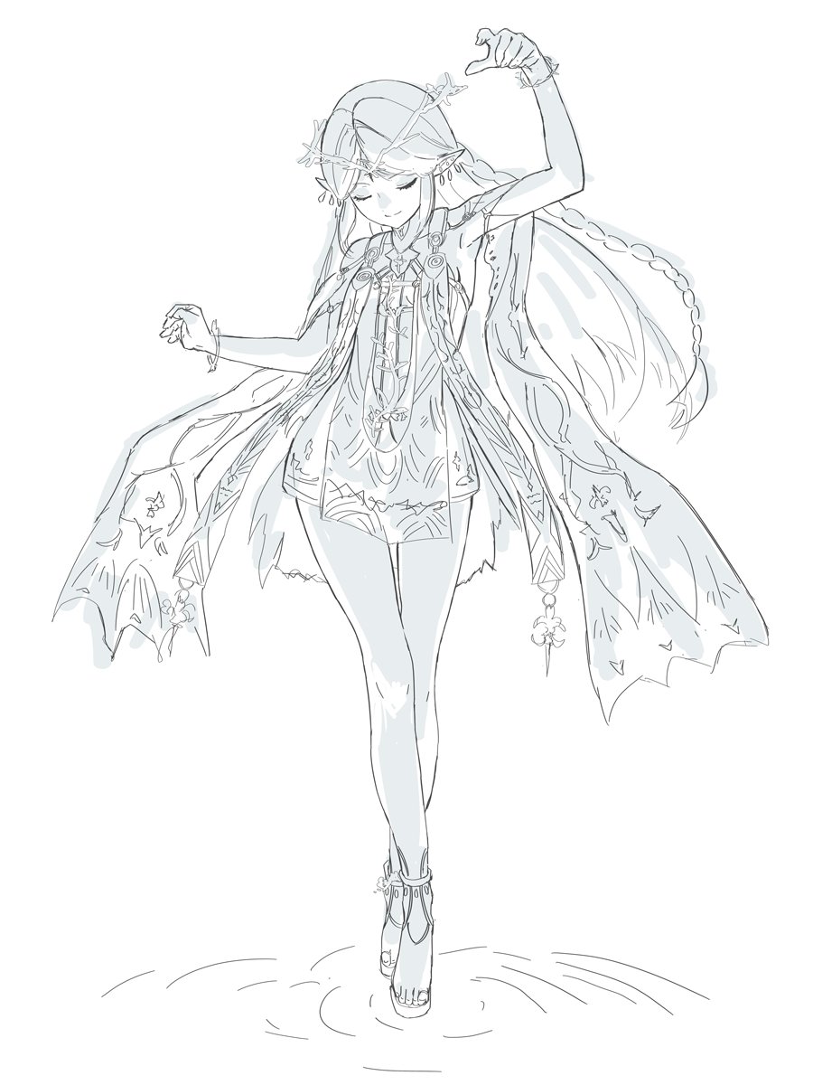 1girlankletarm uparmpitsbare armsbare legsbraceletbraidclosed eyesclosed mouthcrossed legscrown of thornsdressearringsfacing viewerfleur-de-lisforehead tattoofull bodygreyscalehand upjewelrylight smilelong hairmiddle partmonochromemultiple earringsparted bangspelvic curtainpointy earsshort dressside braidsimple backgroundsolosplit mouthstoletacet mark (wuthering waves)tattootoesu uwalkingwalking on liquidwatson crosswhite background