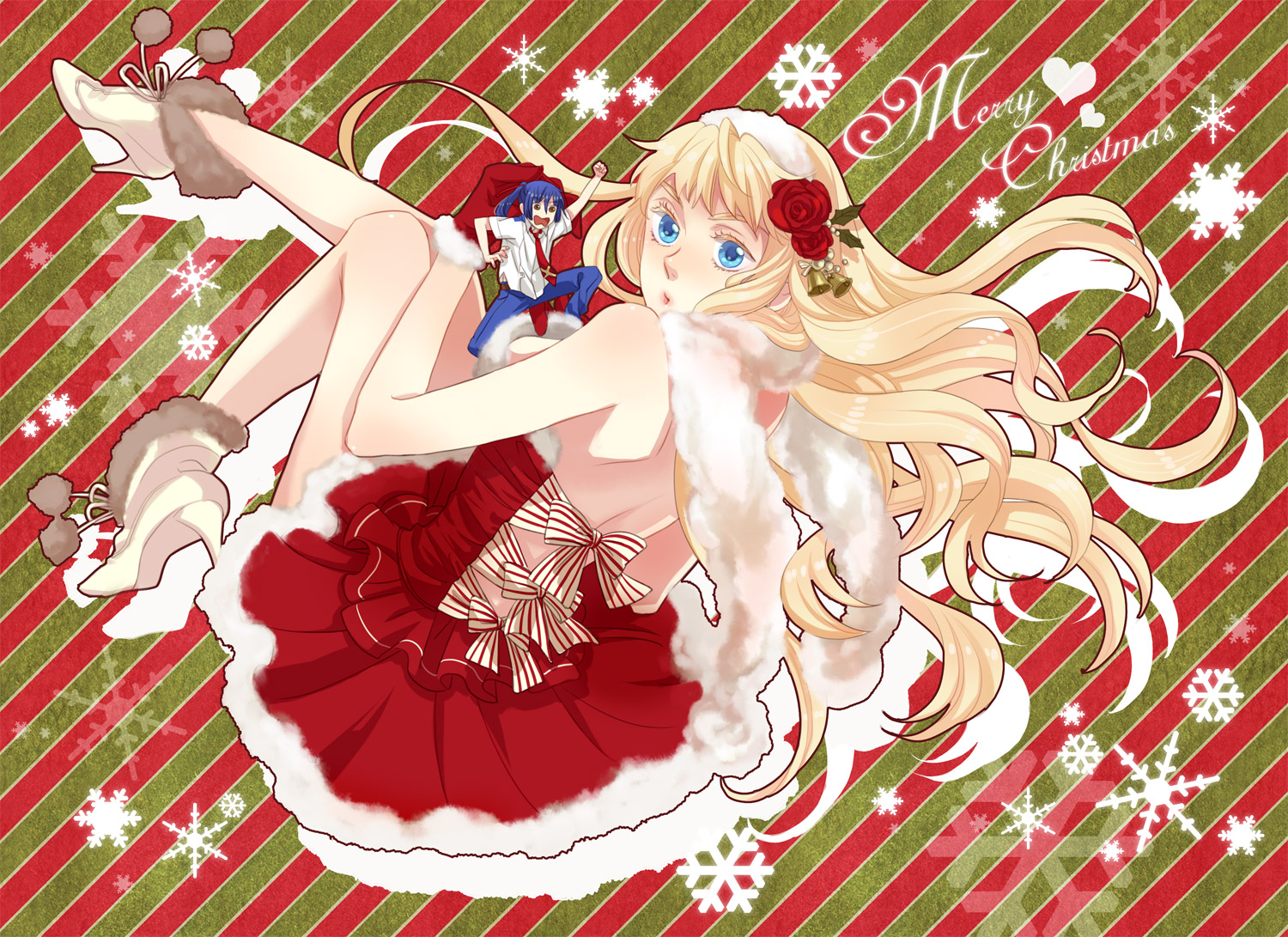 :o00s1boy1girlblonde hairblue eyeschristmasdressgiantgiantesshigh heelslong hairmini personminiboysanta costumeshoes