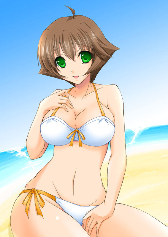 00sbikinibreastsbrown haircleavagegreen eyeshair between eyeshalternecklarge breastsshort hairside-tie bikini bottomsoloswimsuitwhite bikini