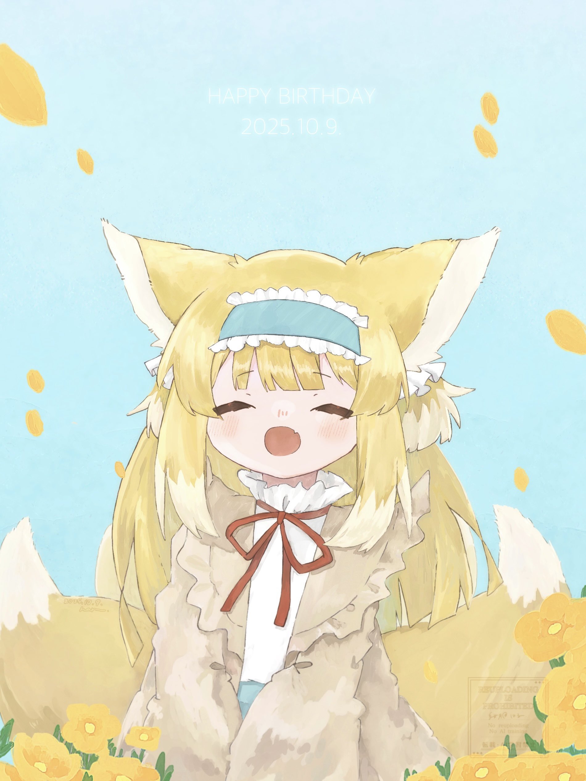 1girlanimal earsblonde hairblue hairbandclosed eyesdatedflowerfox earsfox girlfox tailfrilled hairbandfrillshairbandhappy birthdaykitsunelong hairneck ribbonofficial alternate costumeopen clothesopen mouthred ribbonribbonshirtsolotailwatermarkwhite shirt