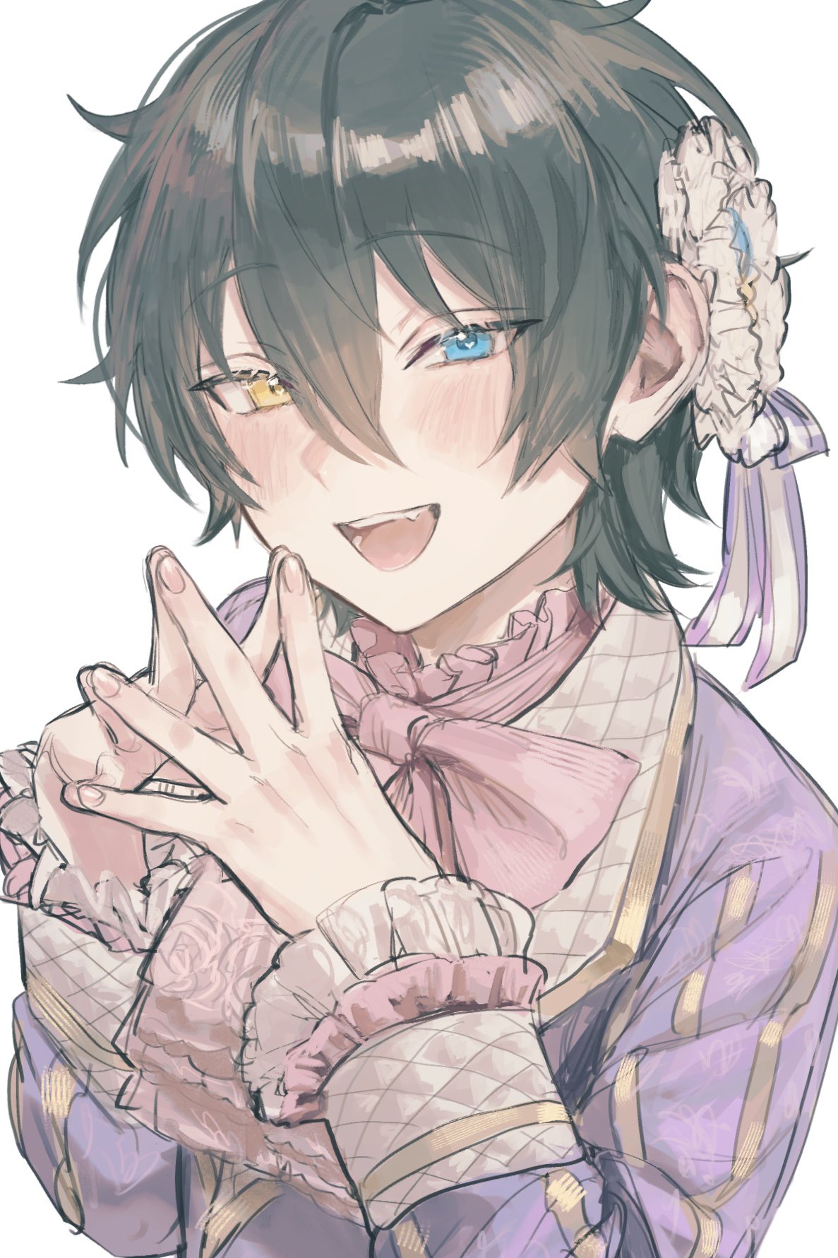 :d1boyamamori14 9blue eyesblushbowbowtiegreen hairhair between eyeshair ornamentheterochromialong sleeveslooking at viewermale focusopen mouthpink bowpink bowtiepurple shirtshirtshort hairsimple backgroundsmilesolosteepled fingersupper bodywhite backgroundyellow eyes