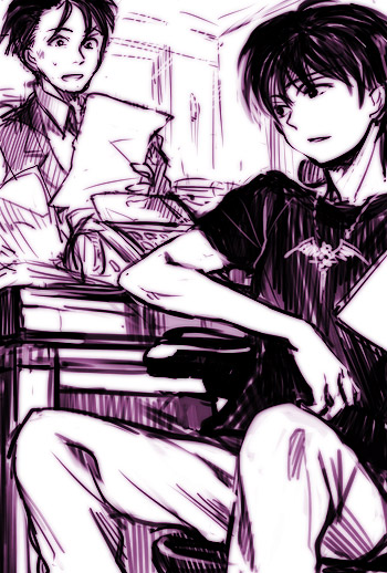 nai ga, ishmael (project moon), rodion (project moon), yi sang (project moon), limbus company, project moon, game cg, highres, official art, 1boy, 2girls, 2others, bag, black eyes, black hair, black shirt, black vest, book, bow, brown hair, brown pants, building, city, coat, collared shirt, cup, disposable cup, drinking, hair bow, headband, holding, holding book, holding cup, liu association south uniform, long hair, multiple girls, multiple others, necktie, orange hair, pants, plastic bag, reading, red coat, red necktie, shirt, short hair, skyscraper, solo focus, teabag, tote bag, vest, white shirt, yin yang