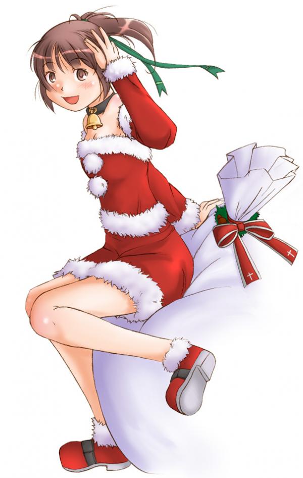 1girlbrown hairchristmasdetached sleeveselbow glovesfemale focusglovesopen mouthponytailsanta costumeshort hairsolo