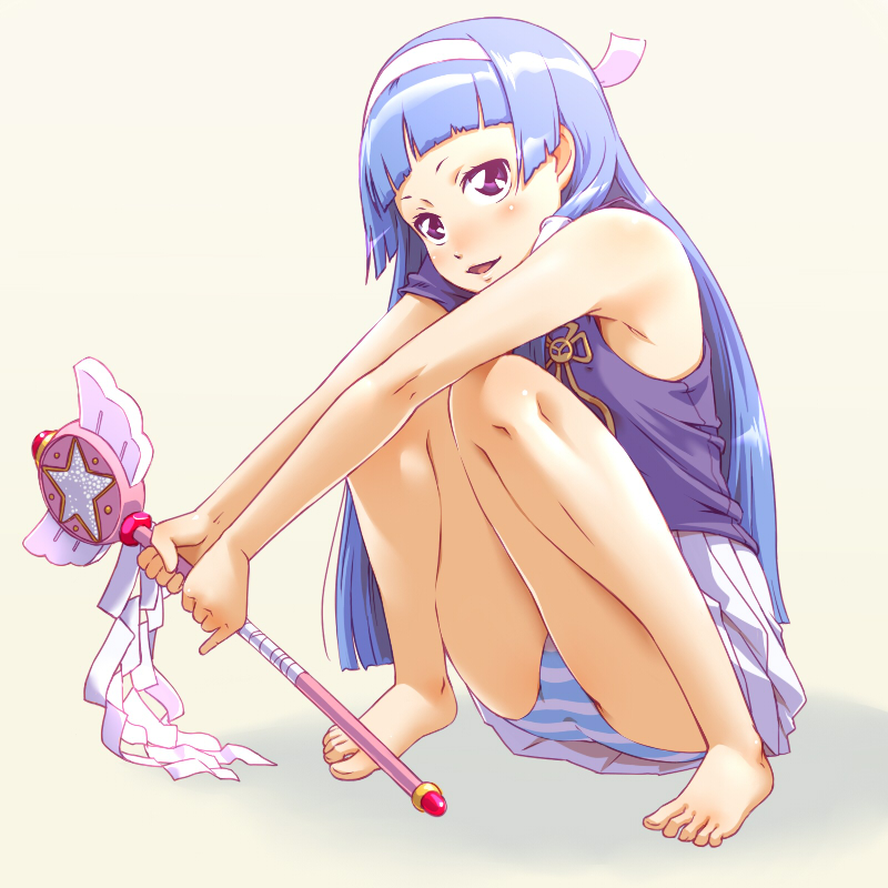 00s1girlarmpitsartistic errorbarefootblue hairblunt bangsfeetfemale focushairbandlong hairpantiespurple eyessolosquattingstriped clothesstriped pantiesunderwearwand
