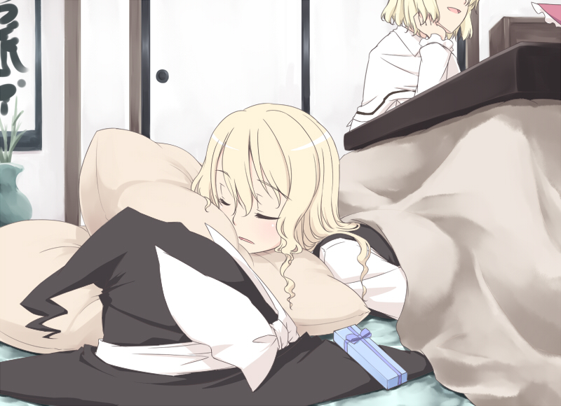 2girlsblonde hairclosed eyesfemale focusgifthatindoorskotatsulong hairlyingmultiple girlssleepingsliding doorstableupper bodywitchwitch hat