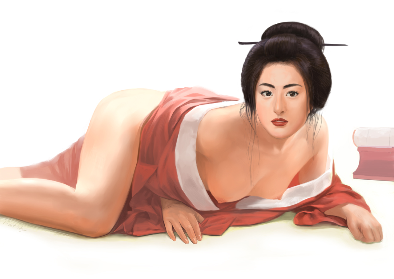 1girlblack hairbreastsfemale focusgeishahair bunhair ornamenthairpinjapanese clotheskimonolyingnihongaminipplessingle hair bunsolo
