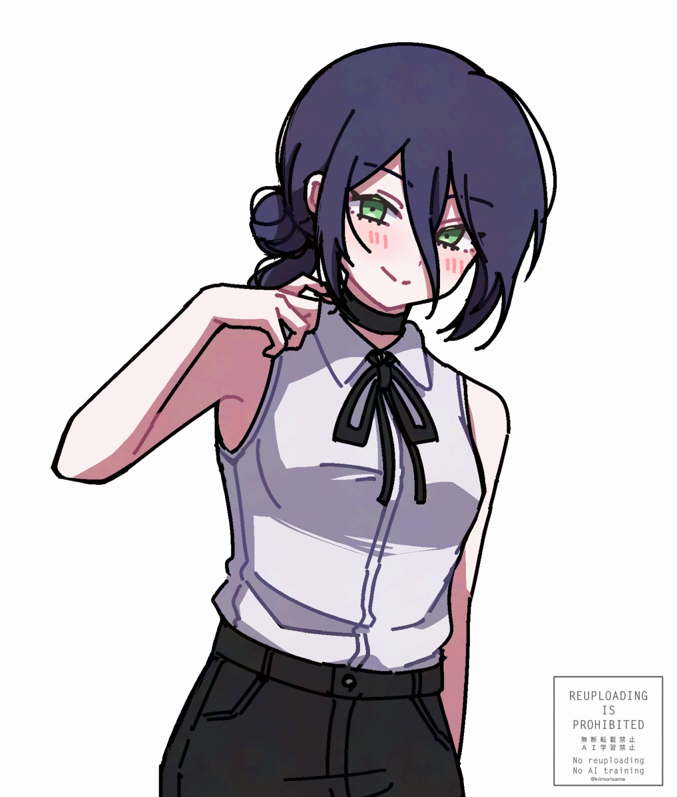 1girlarm at sidebare armsbare shouldersblack chokerblack pantsblack ribbonbreastschokerclosed mouthcollared shirtcowboy shotdenimdouble-parted bangsgreen eyeshair between eyeshair bunhalf-closed eyeshand upjeanslong hair between eyeslooking at viewermedium hairneck ribbonpantspurple hairribbonshirtsimple backgroundsingle hair bunsleevelesssleeveless shirtsmall breastssmilesolostandingwatermarkwhite backgroundwhite shirt