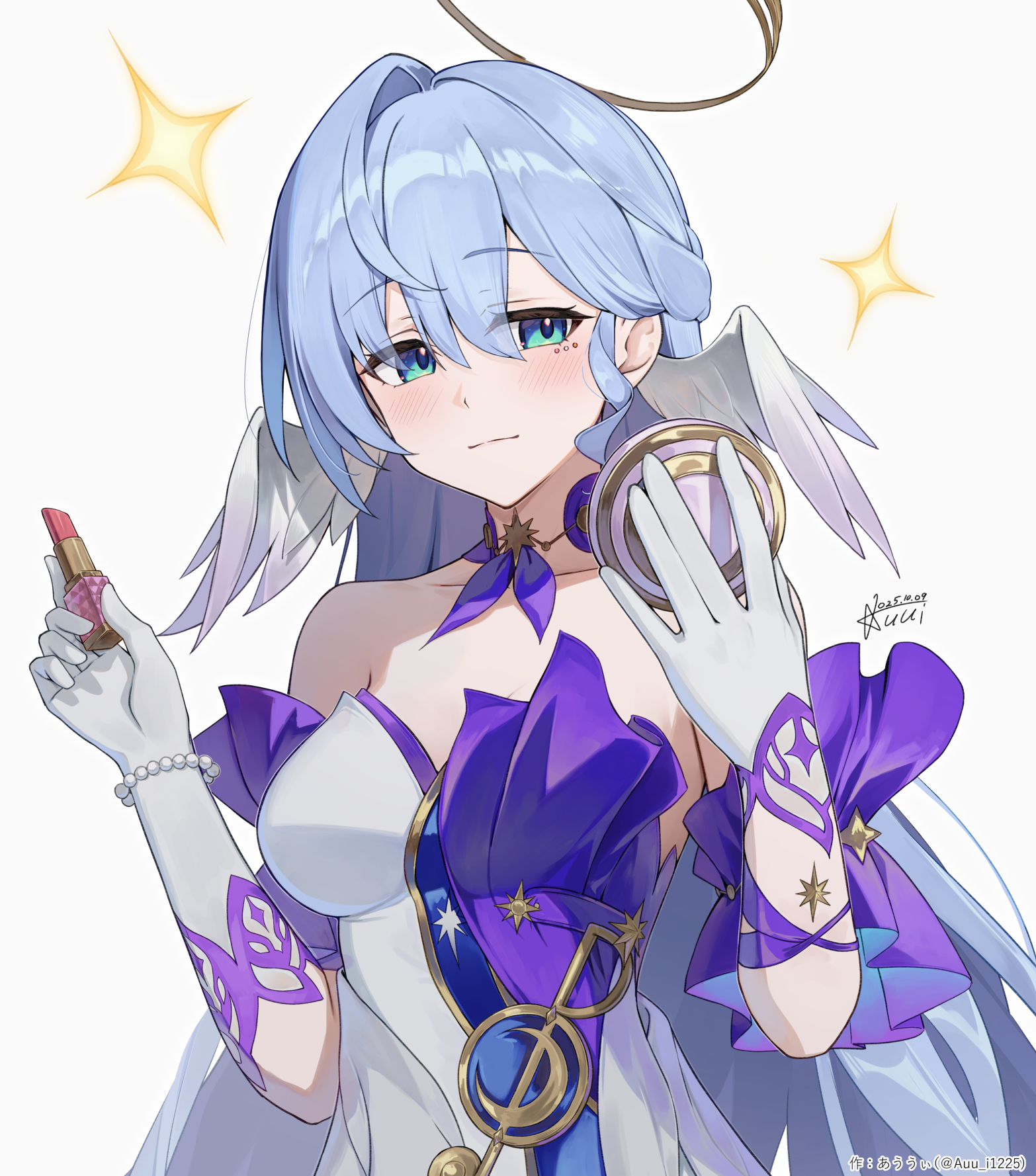 1girlartist namebare shouldersblue eyesblue hairbreastscleavagecosmeticsdressglovesgrey backgroundhalohead wingsholdingholding lipstick tubeholding mirrorlarge breastslipstick tubelong hairmirrorsimple backgroundsmilesolovery long hairwhite backgroundwhite dresswhite gloveswings