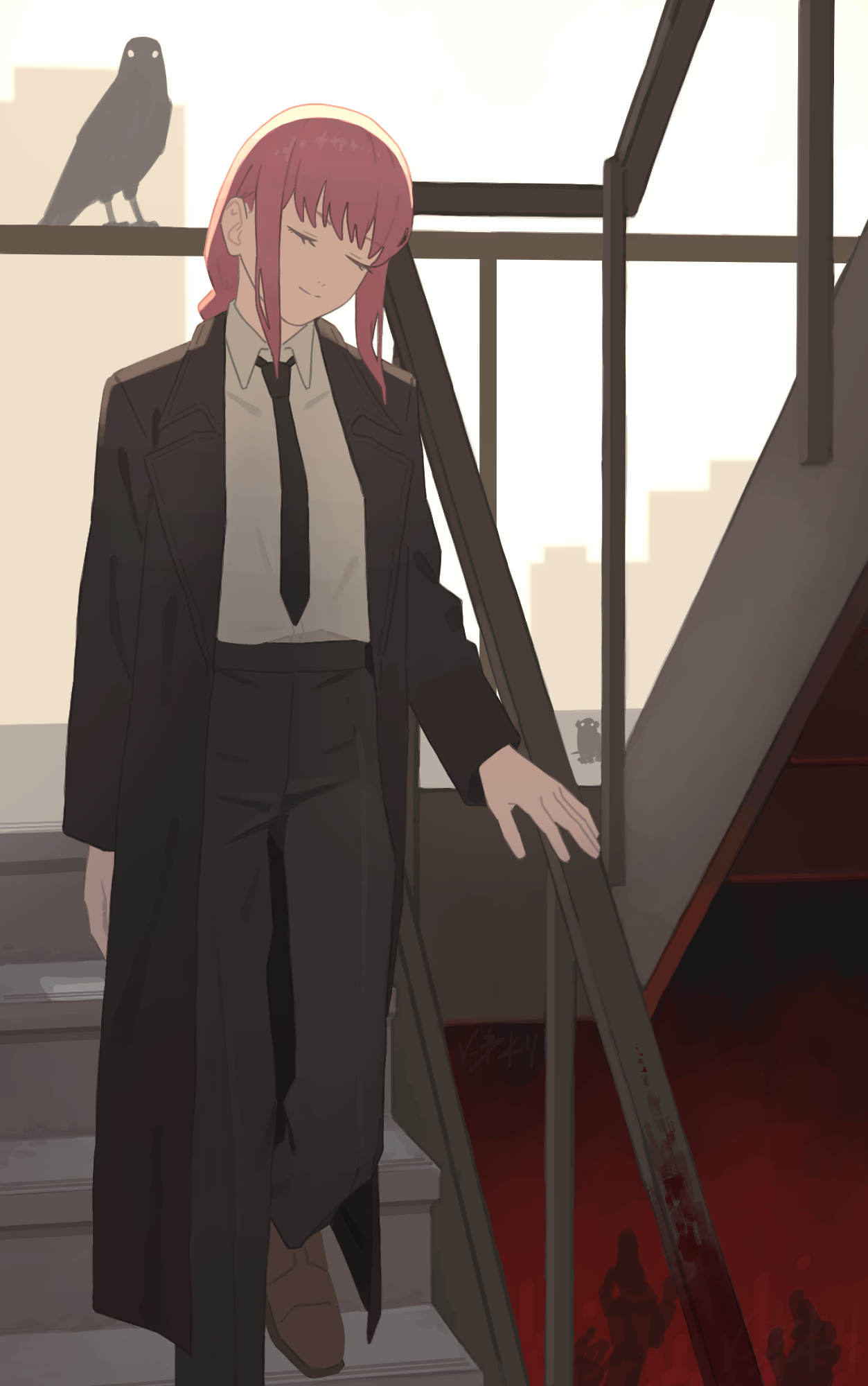 1girlbirdblack coatblack necktieblack pantsclosed eyesclosed mouthcoatcrowformal clothesnecktiepant suitpantsred hairsidelockssolostairssuittrench coat
