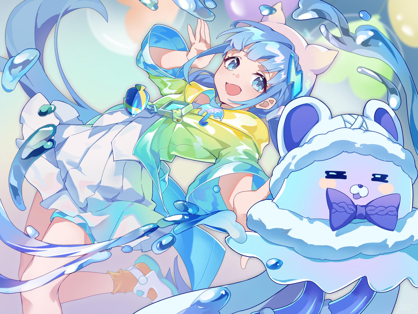 konoe nanami, lamune, highres, 00s, backpack, bag, blue eyes, gloves, hair ornament, hairpin, hat, long hair, purple hair, randoseru, scarf, solo, thighhighs, zettai ryouiki