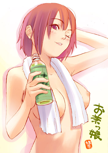 1girlarms upblushbottlebreastsbrown eyesbrown hairdrinkfemale focusnipplesnudeone eye closedshort hairsmilesolotowelwink