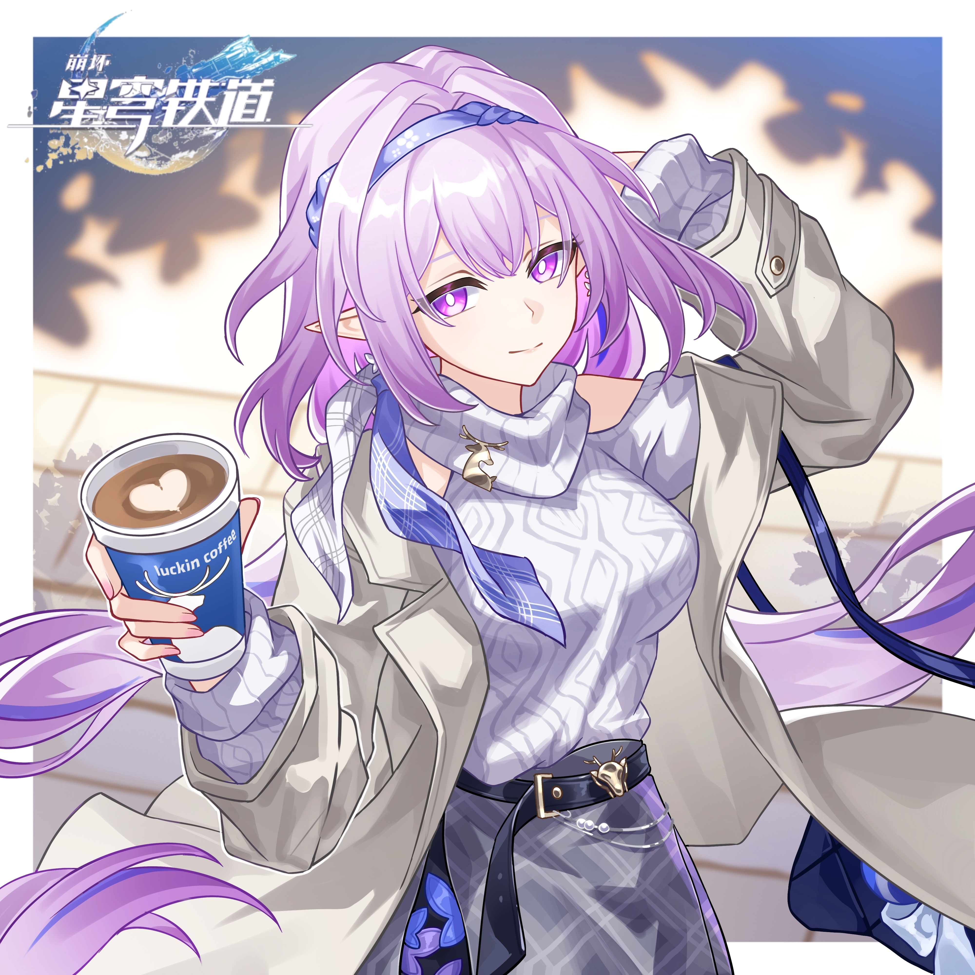 1girlbagbeltblue hairbandbreastsbright pupilsclosed mouthcoatcoffee mugcopyright namecupdisposable cupearringshair ribbonhairbandhandbagholdingholding cupjewelrylong hairlong sleeveslooking at viewermugmulticolored hairofficial alternate costumeopen clothesopen coatpink eyespink hairplaid clothesplaid skirtpointy earspurple eyespurple hairribbonskirtsmilesolosweatervery long hairwhite pupilswhite sweater