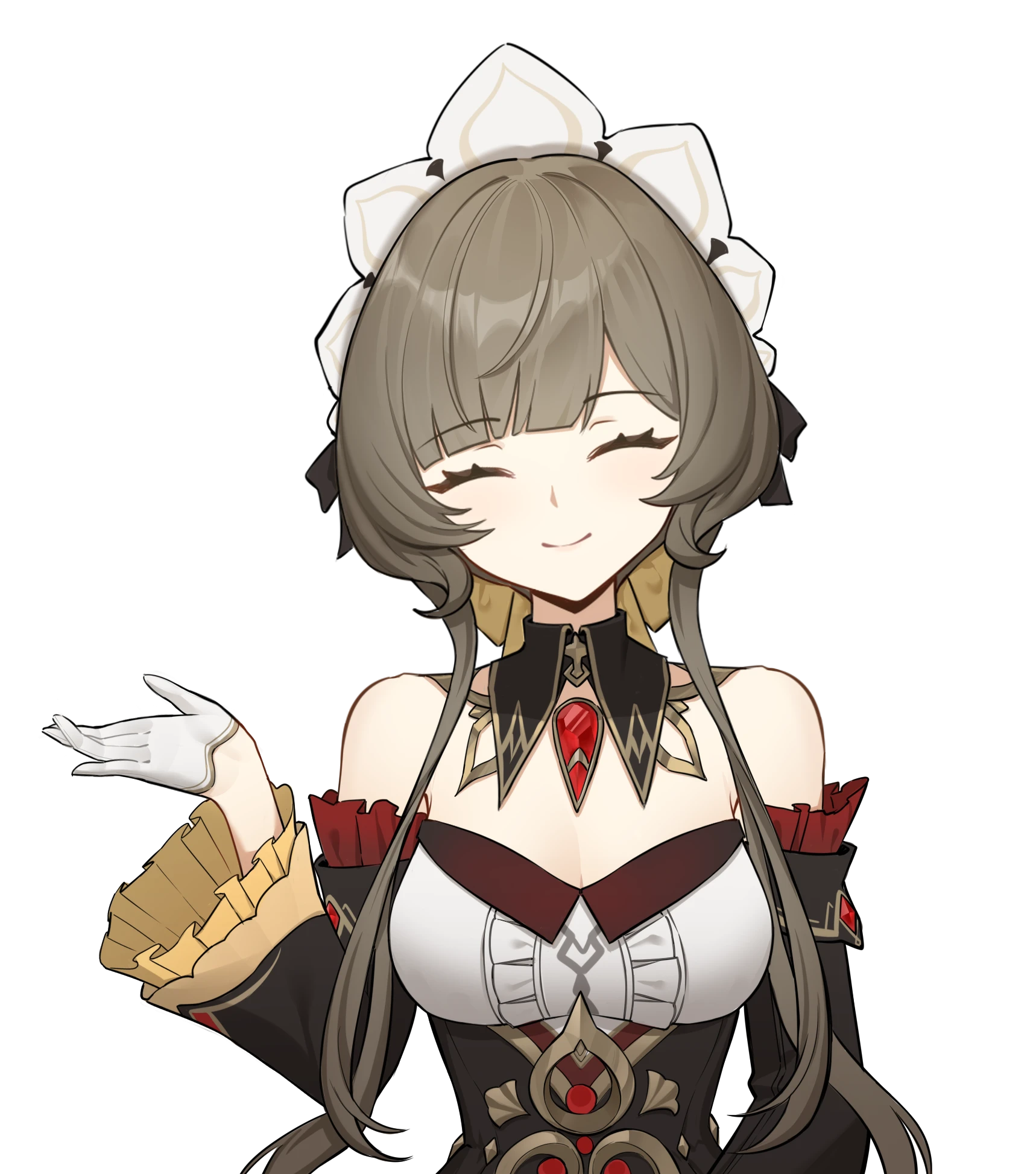 1girlbare shouldersblack backgroundblack dressbreastsbrown haircleavageclosed eyesclosed mouthdetached collardetached sleevesdressfacing viewerfrilled sleevesfrillsgloveshand upjewelrylong hairlong sleevesmaid headdressshort hair with long lockssimple backgroundsmilesoloupper bodywhite gloves