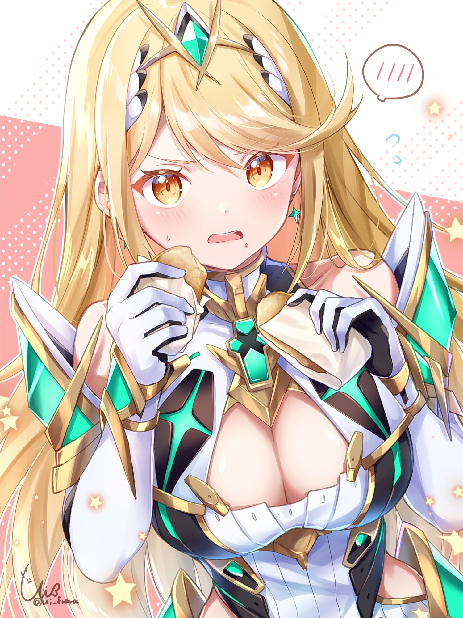 subspaceskater, mythra (xenoblade), pyra (xenoblade), xenoblade chronicles (series), xenoblade chronicles 2, absurdres, highres, 2girls, blonde hair, blush, bob cut, chest jewel, choker, core crystal (xenoblade), cowlick, english text, eye contact, fingernails, futanari, grabbing another's breast, grabbing from behind, green nails, groping, handjob, headband, kneeling, long hair, looking at another, looking back, motion lines, multiple girls, penis, reach-around, red hair, short hair, sweatdrop, swept bangs