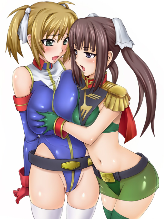 2girlsbeltbelt skirtblonde hairblushbreast pressbreastsbrown hairearth federationgrabbing another's breastgropinghighleghighleg leotardhuge breastsleotardlong hairmidriffmultiple girlsnavelopen mouthsee-through clothessymmetrical dockingthighhighsyurizeon