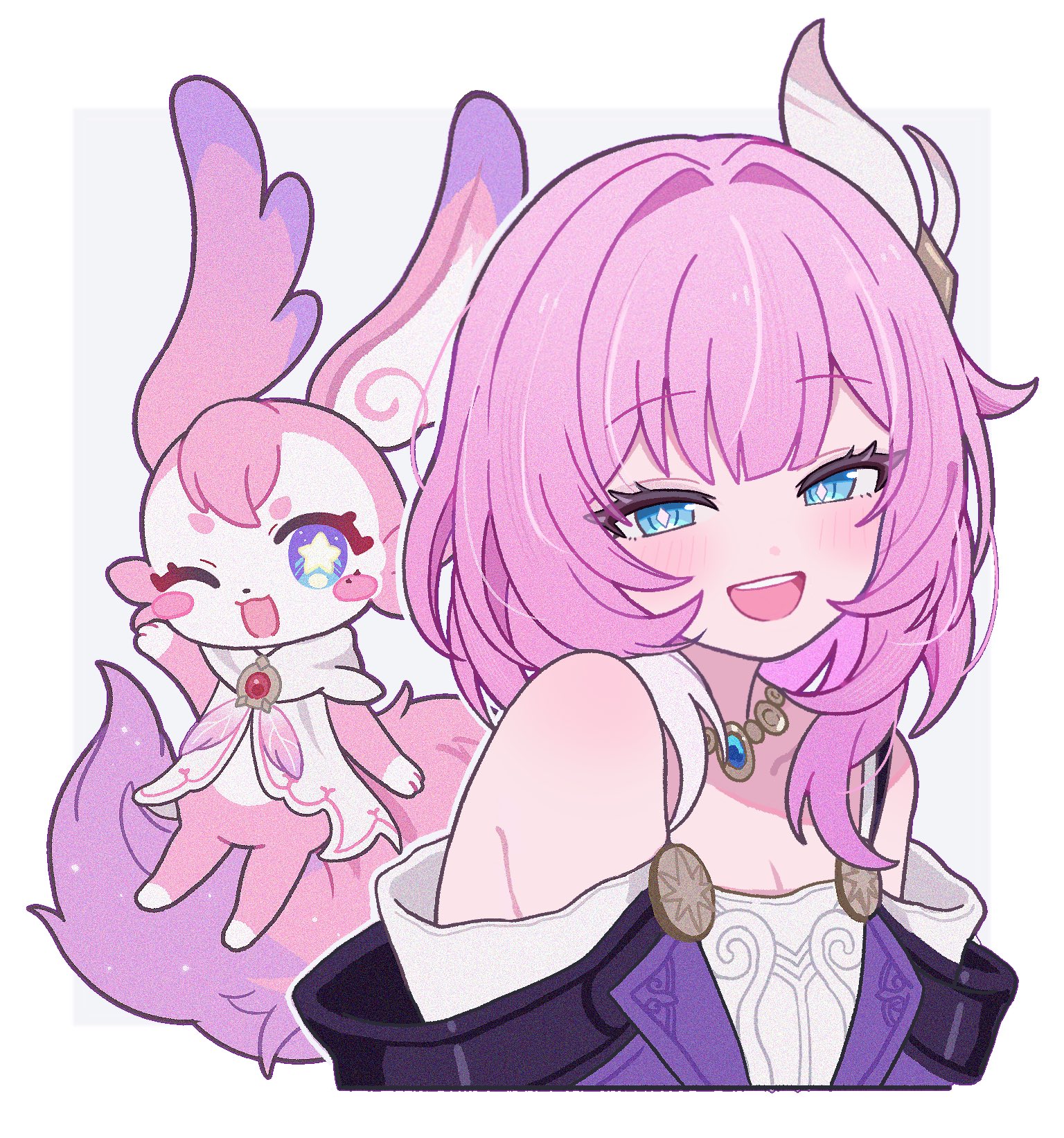 1girlbare shouldersblue eyesbreastscleavagecoatcyrene (aedes elysiae) (honkai: star rail)dresshair ornamentjewelrylooking at viewermedium hairmulticolored hairnecklacepink hairpurple coatsimple backgroundsmall breastsstar (symbol)star-shaped pupilssymbol-shaped pupilstailtwo-tone hairupper bodywhite backgroundwhite dresswhite hair