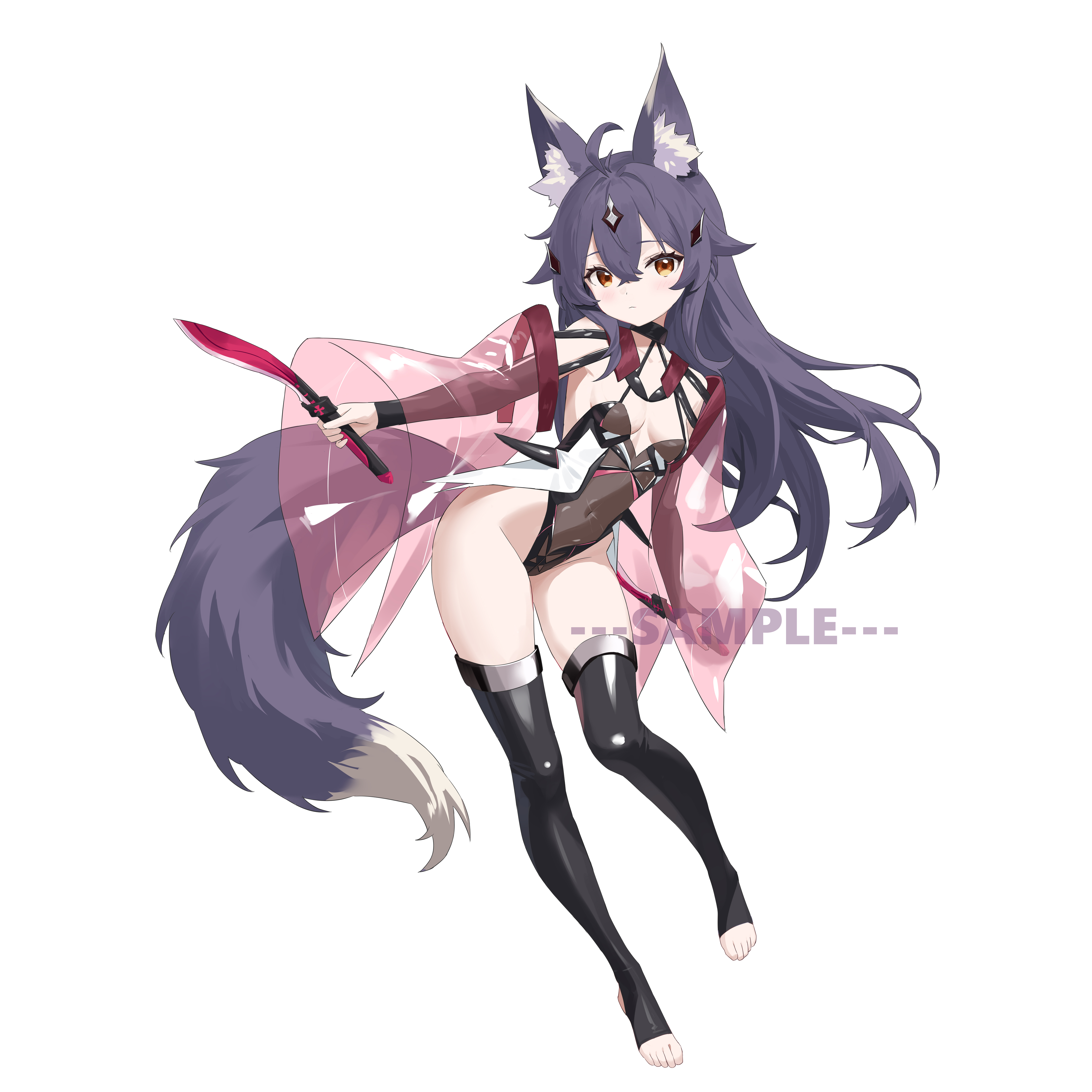 1girlahogeanimal ear fluffanimal earsbare shouldersblack hairblack thighhighsbreastsbrown leotardclosed mouthdetached sleevesfull bodyhair between eyeshighleghighleg leotardholdingholding swordholding weaponleotardlong hairlooking at viewerred eyessee-through clothessee-through sleevessimple backgroundsmall breastssolostirrup legwearswordtailthighhighsthighstoeless legweartoesweaponwhite backgroundwide sleeveswolf earswolf tail