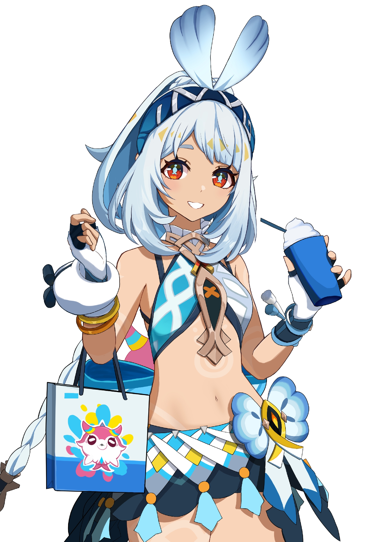 1girlbagbare shouldersbikiniblue hairblue pupilsblushbraceletbraidbreastscowboy shotcupdisposable cupdrinking strawfingerless glovesfoodglovesgrinhairbandhands upholdingholding bagice creamjewelrylong hairlooking at viewermidriffminiskirtnavelponytailred eyessidelockssimple backgroundskirtsmall breastssmilesolostandingstomachswimsuitsymbol-shaped pupilstanteeththick eyebrowsvery long hairwhite backgroundwhite gloveswhite hair