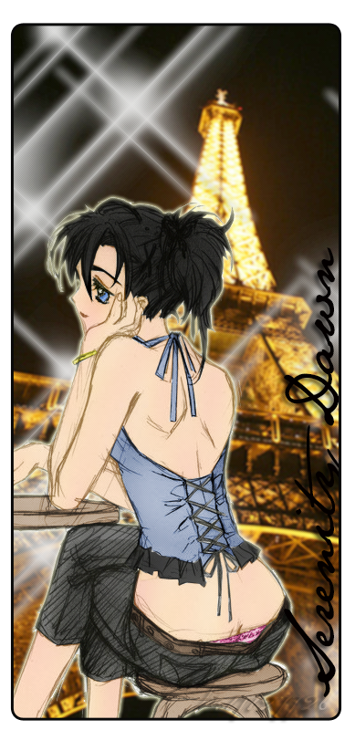 black hairblue eyesbutt crackcapri pantscomiceiffel towerhalterneckpantiespantspink pantiesponytailsittingsolostooltableunderwear