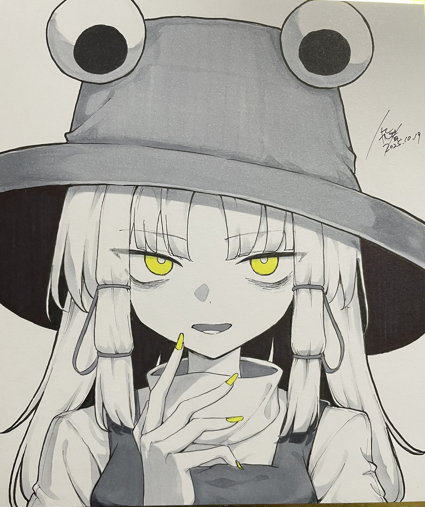 1girldatedhair ribbonhatjapanese clotheslong hairlooking at viewerribbonshikishisidelockssignaturesolospot colortress ribbontsurimeupper bodyvestyellow eyesyellow nails