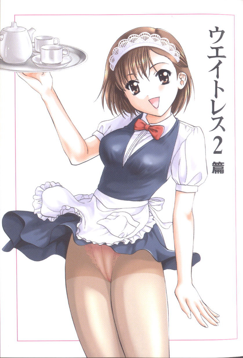 1girlbowbowtiebrown eyesbrown hairclothes liftcrotch seamfemale focusopen mouthpantiespanties under pantyhosepantyhosepantyshotskirtskirt liftsmilesolotrayunderwearupskirtwaitress
