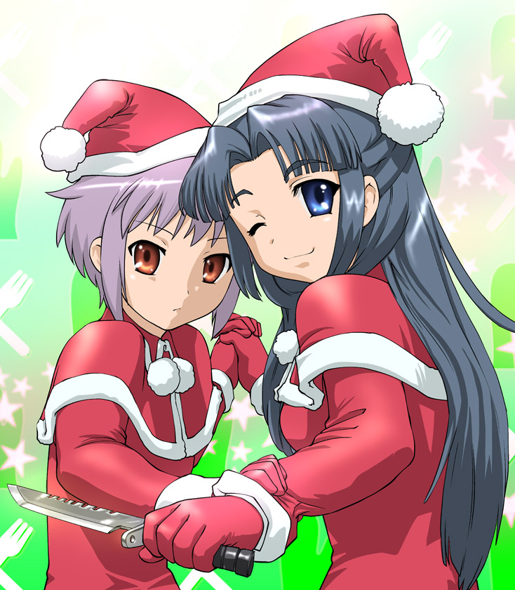 00s2girlsblue eyesblue hairbrown eyescapeletgloveshatknifelong hairmultiple girlssanta costumesanta hatshort hairwink