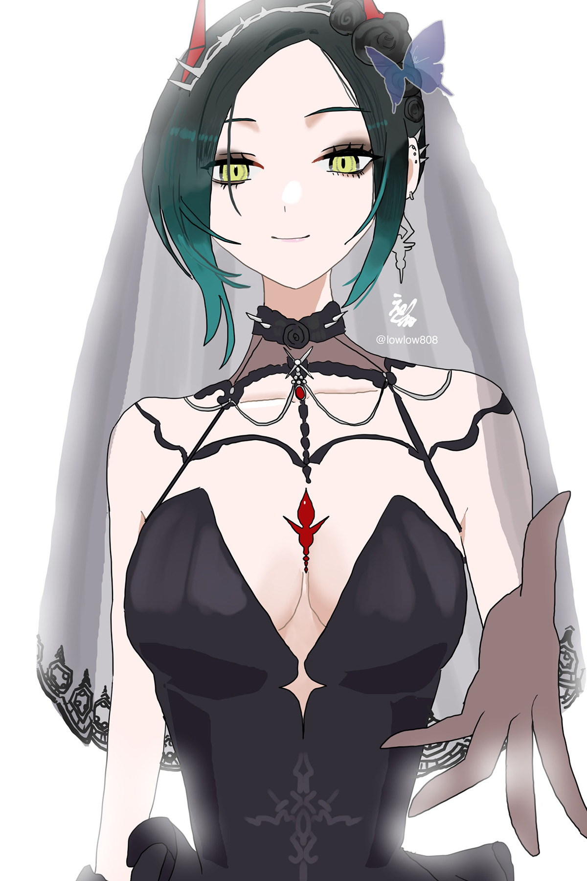1girlblack dressblack eyeshadowblack flowerblack hairbreastsbridal veilbutterfly hair ornamentclosed mouthdressear piercingeyeshadowflowergradient hairgreen hairhair flowerhair ornamenthornslooking at viewermakeupmedium breastsmulticolored hairofficial alternate costumepiercingreachingreaching towards viewerred hornsshort hairsignaturesimple backgroundsmilesolospiked ear piercingtwitter usernameupper bodyveilwedding dresswhite backgroundyellow eyes
