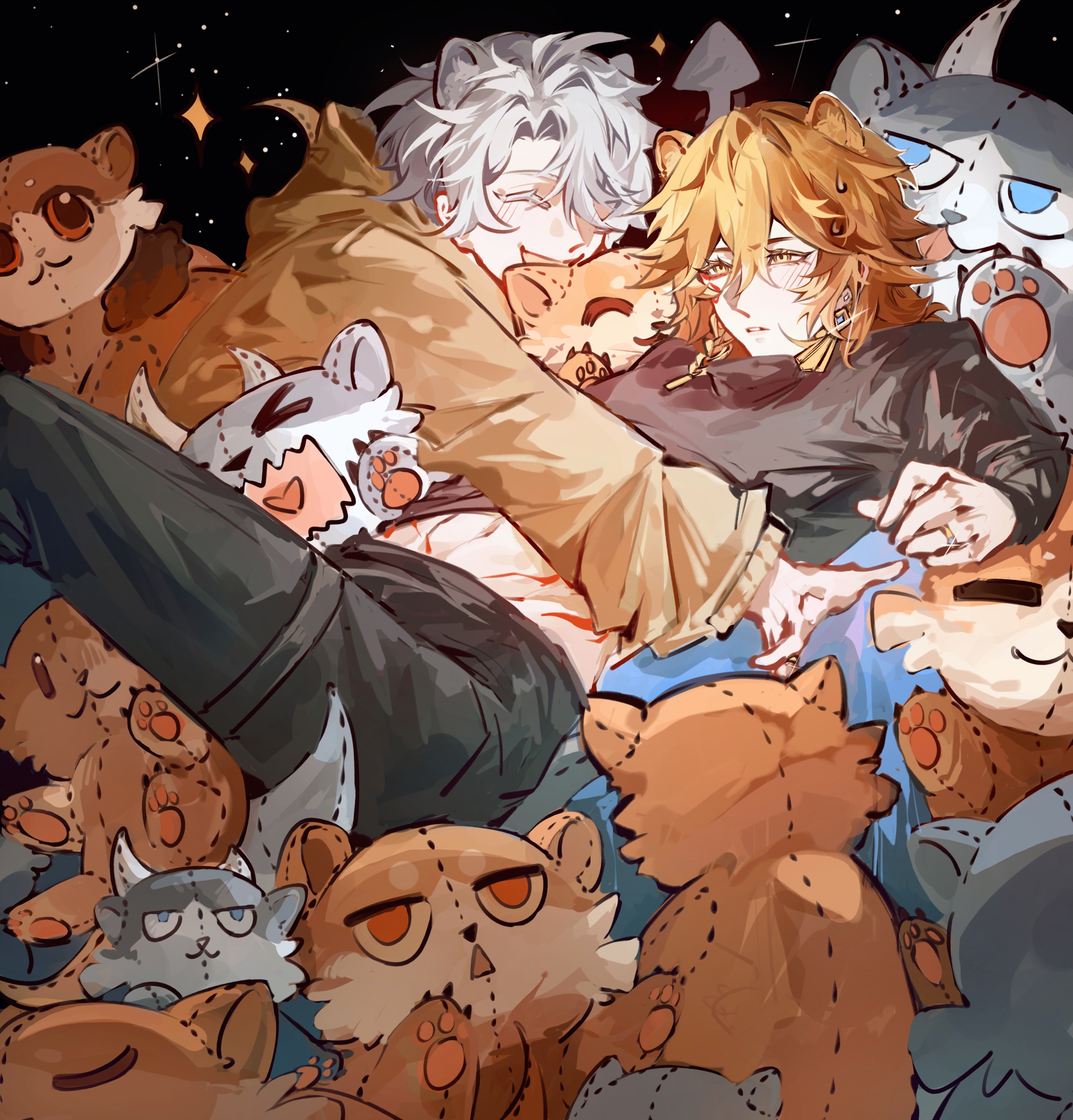 2boysanimal earsantenna hairblack chokerblack pantsblack sweaterblonde hairbraidchokerclosed eyesdog boydog earsearringsfacial tattoogold earringsgradient hairhoodhood downhoodiehugjewelrykerror028lion boylion earsmale focusmedium hairmulticolored hairmultiple boysorange hoodiepantsparted bangsred hairred tattooshort hairside braidstomach tattoostuffed toysweatertattoowhite hairyaoiyellow eyes