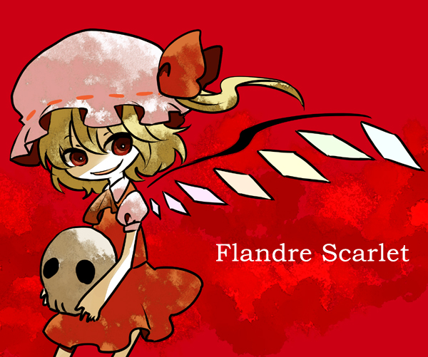 1girlblonde haircharacter namefemale focushatmob capred backgroundred eyesshort hairskullsolostandingvampirewings